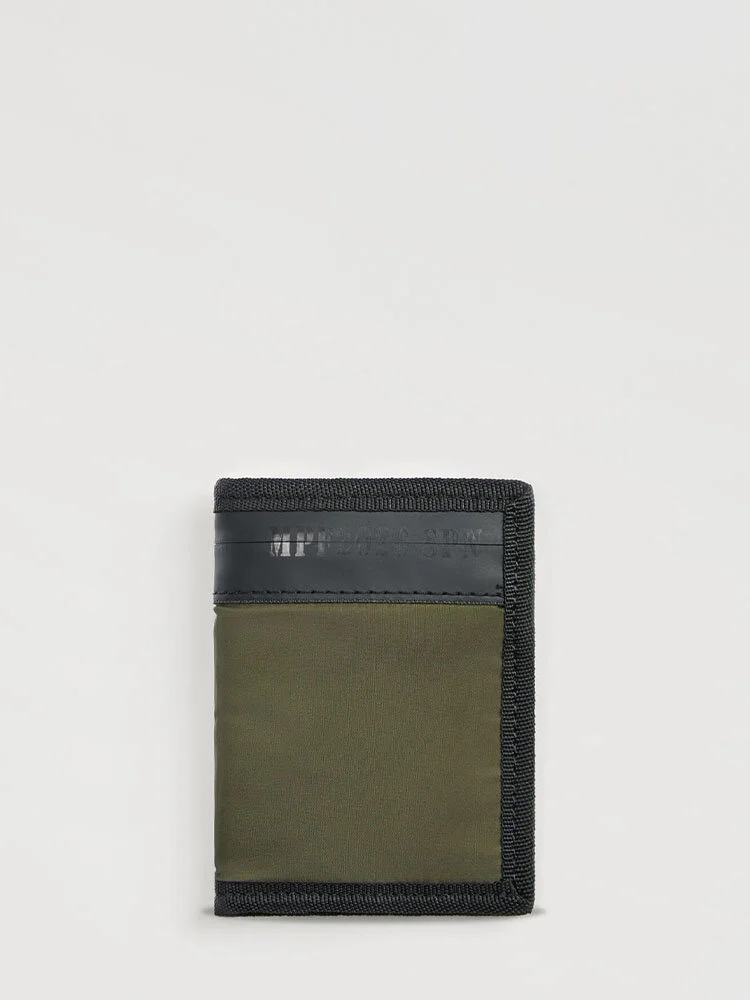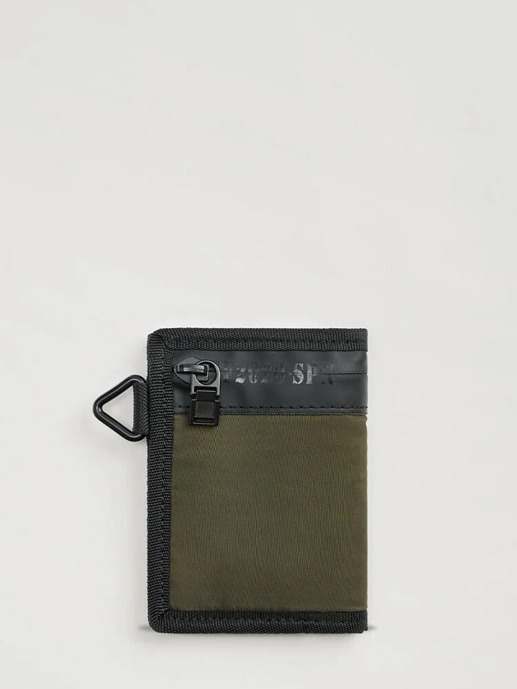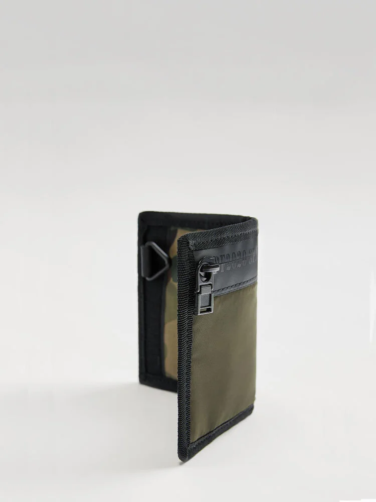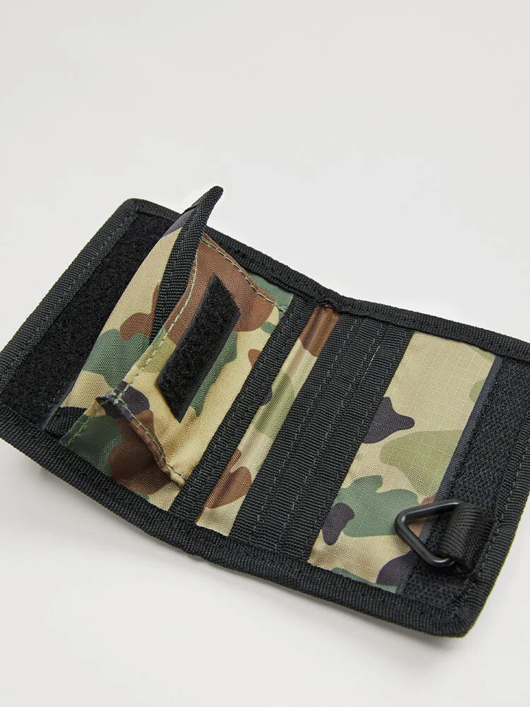 Tarjetero elaborado en tela sintética con múltiples ranuras para guardar ordenadamente tarjetas, billetes, documentos personales de identificación, entre otros. Con estampado de camuflaje.