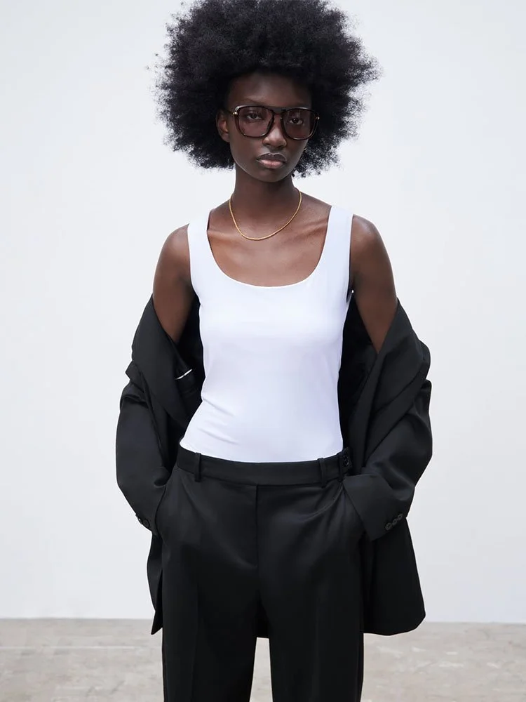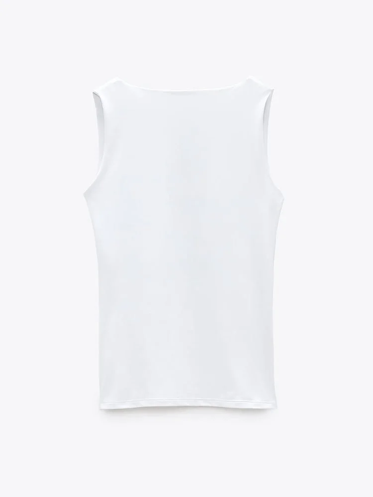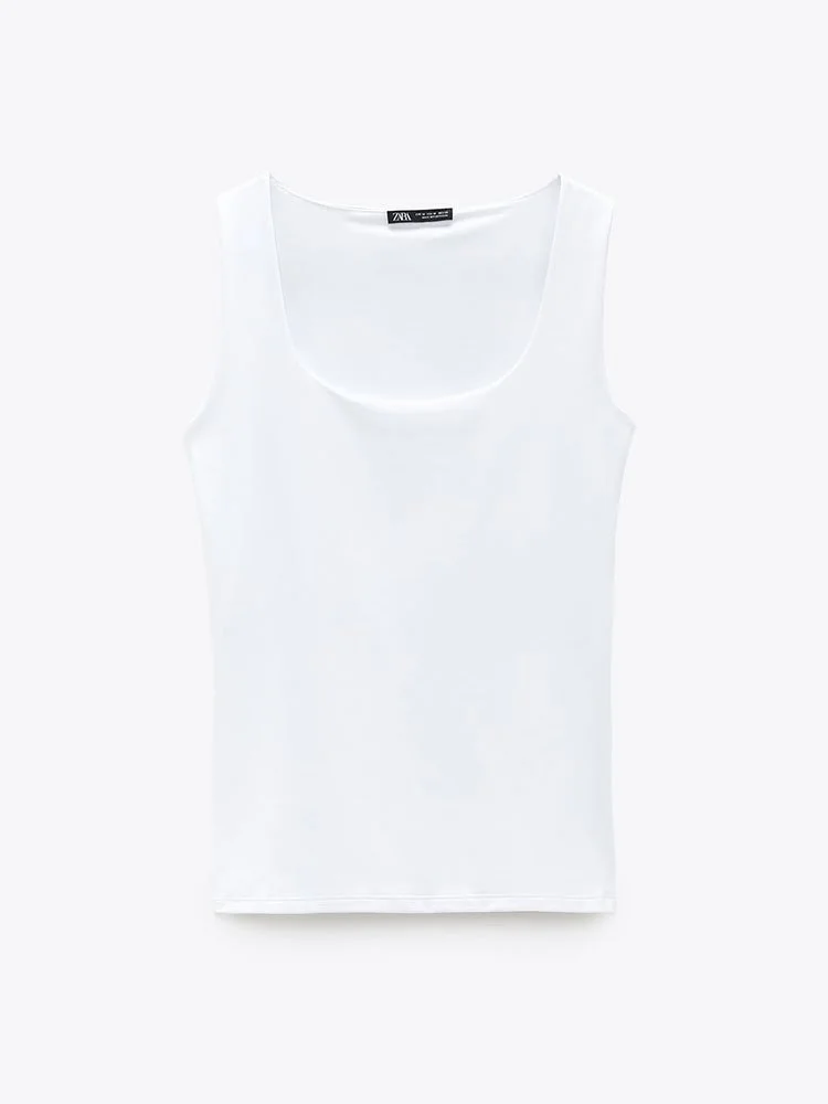 Top básico ajustado en mezcla de poliamida con tirante ancho y refuerzo en pecho.