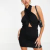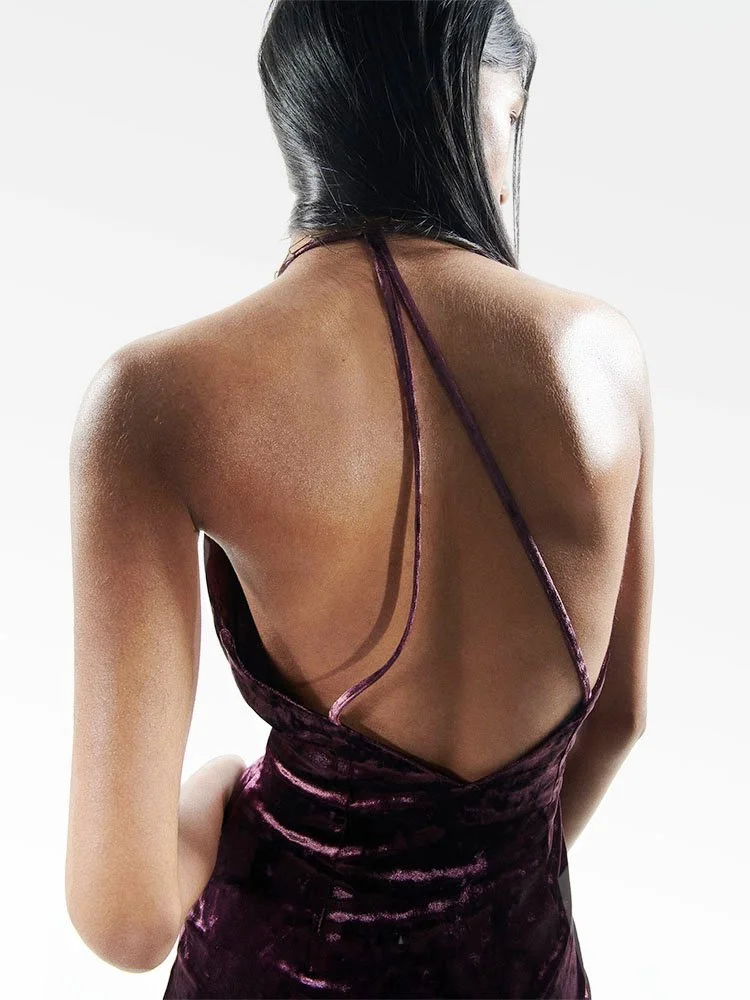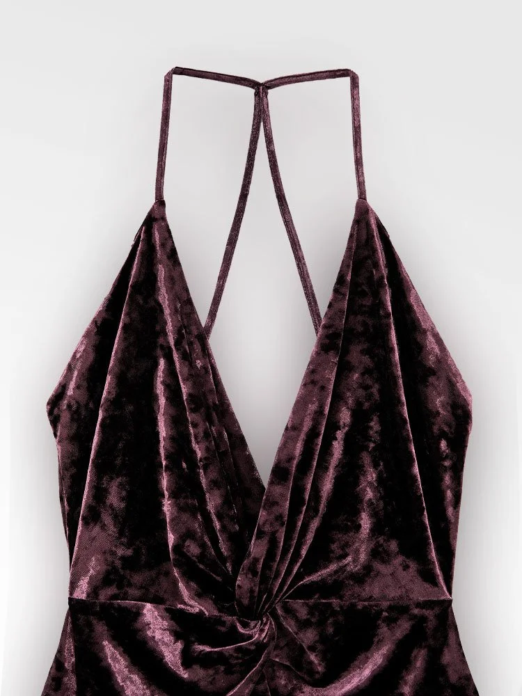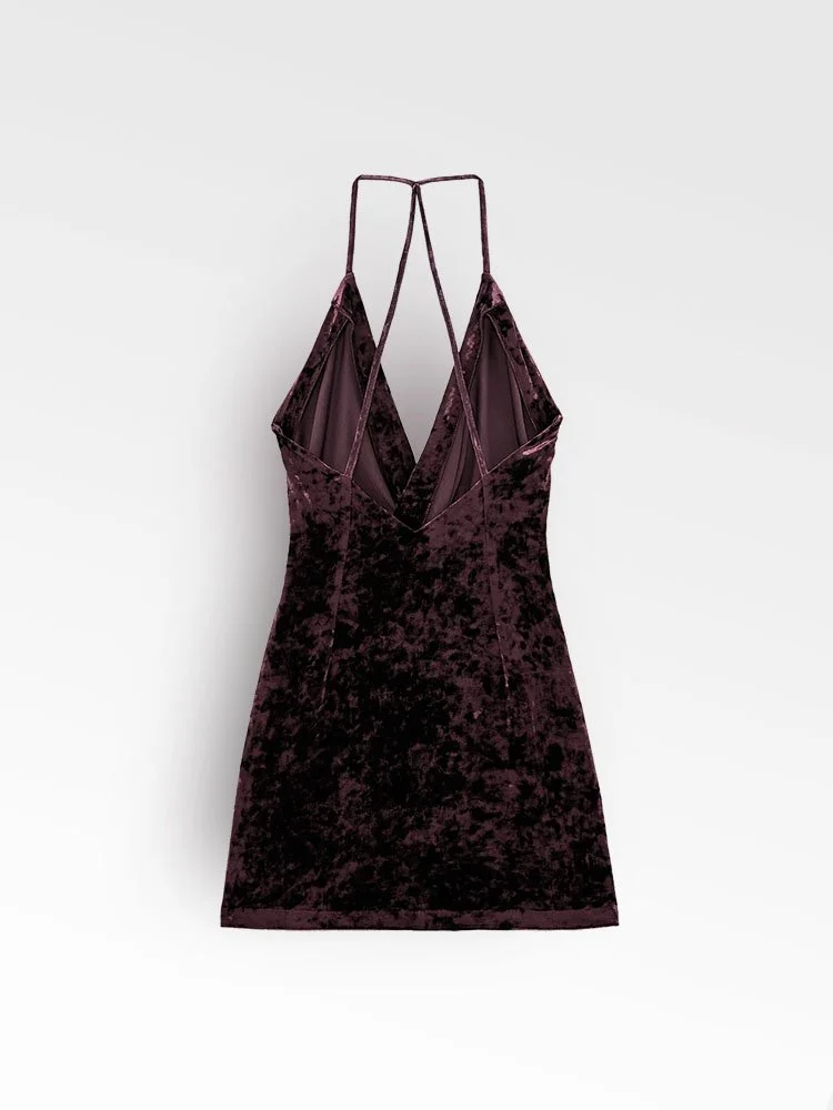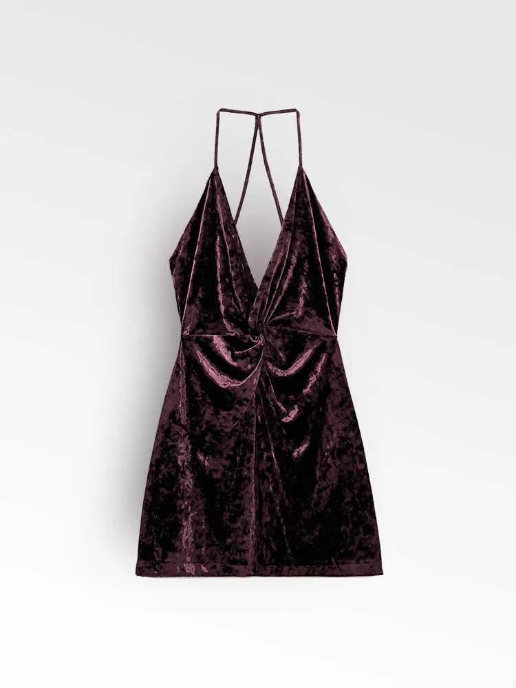 Vestido mini, elaborado en tela terciopelo suave con escote frontal y espalda descubierta adornada con sexys tiros.