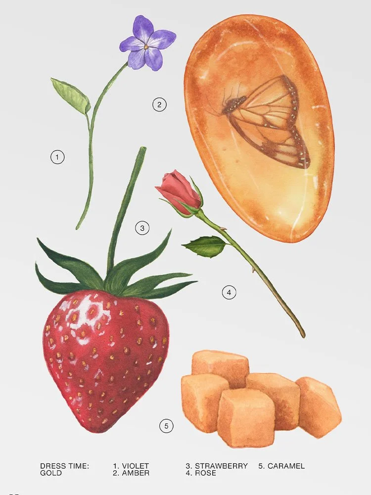 La facetas afrutadas dulces de un melocotón caramelizado fusionan con la flor de fresia creando una irresistible atracción.
